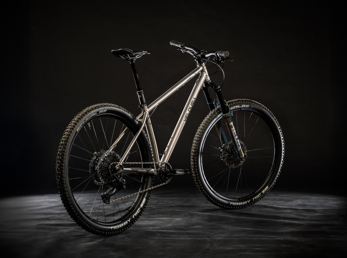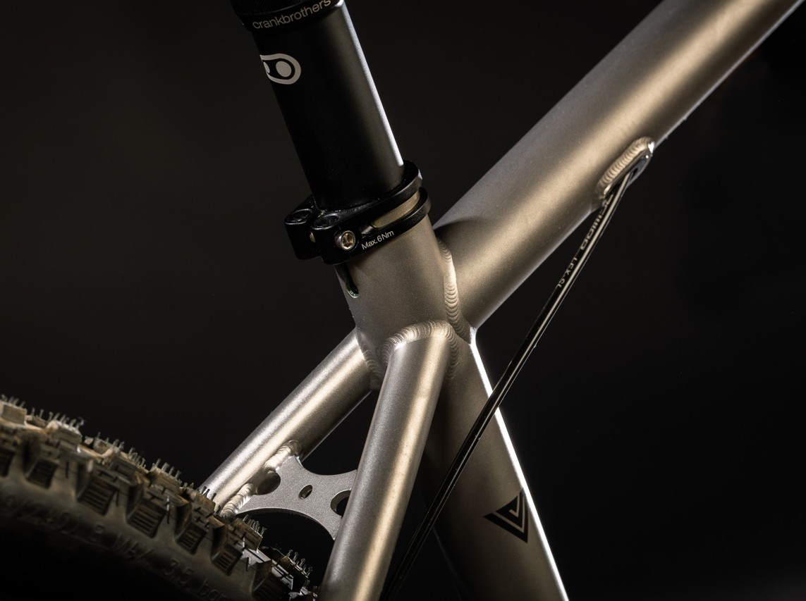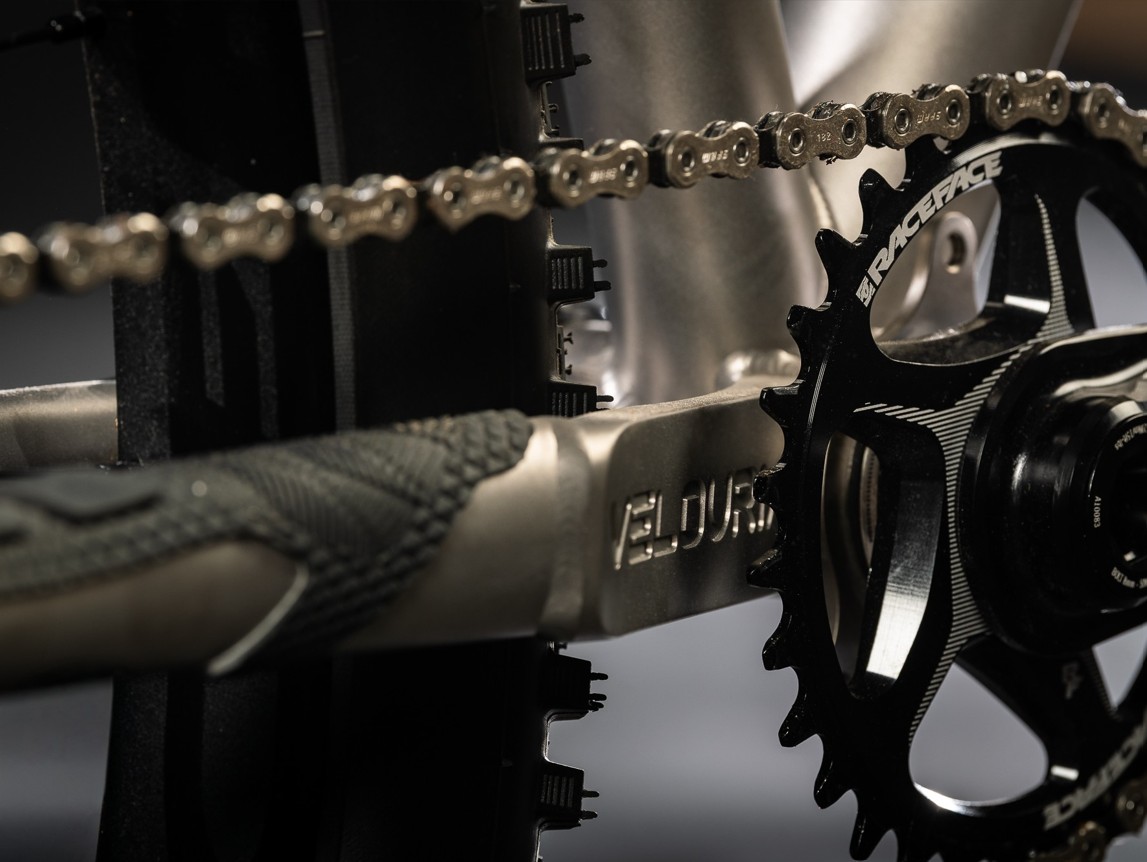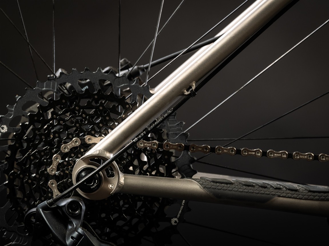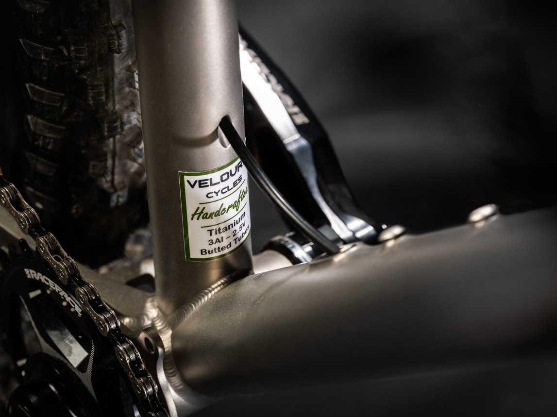 Los detalles son muy importantes en una bicicleta de montaña que se va a someter a un trato exigente, cuadro completo de titanio 3Al 2.5V conificado muy absorbente y con altísima resistencia a la fatiga, refuerzo en la vaina y punteras traseras mecanizadas CNC, ISCG05 para poder usar guiacadenas, pedalier de 73mm BSA roscado para evitar ruidos y averías, guiado interno de cables para protegerlos de posibles roturas por roces o enganchones, tubos de sillín muy cortos para poder poner tijas ajustables de largo recorrido y puntera de cambio con standard Sram UDH. Ahora con roscas en el cuadro para el anclaje de accesorios o nuestra bolsa específica fabricada artesanalmente en Alicante (España) por DOZ.